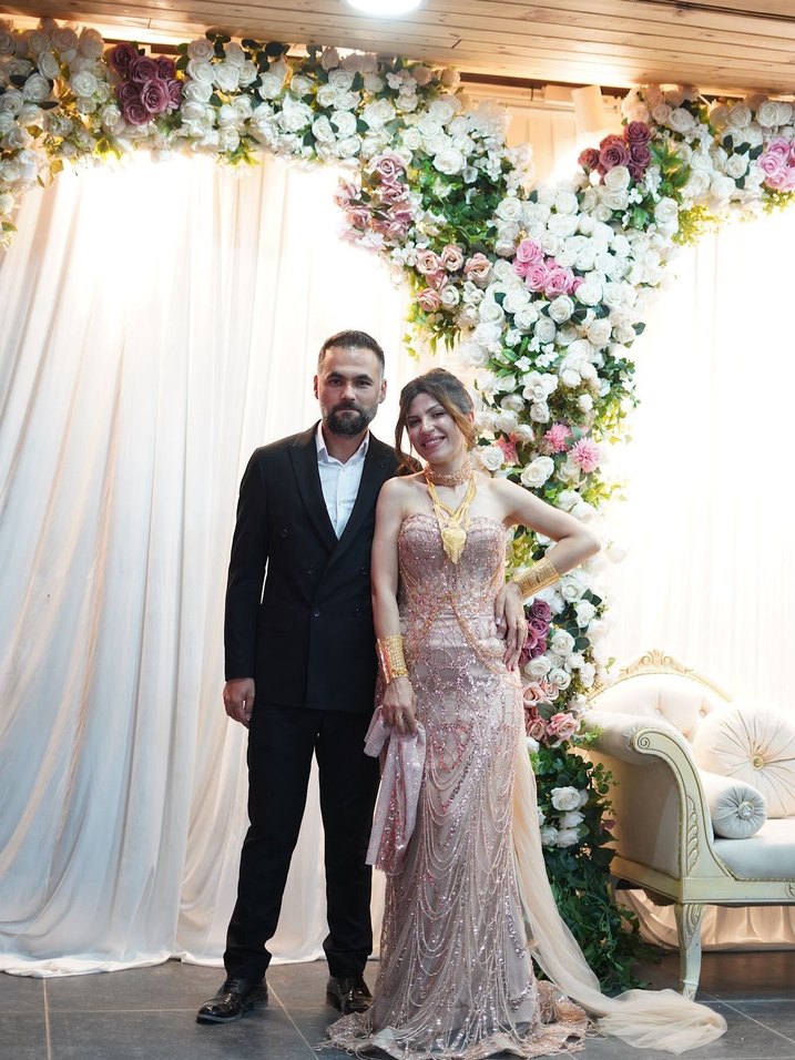 Altın renkli, straplez, uzun ve çiçek desenli nişan elbisesi. Drapeli tasarımı ve kolsuz yapısı ile modern klasik şıklık sunar.