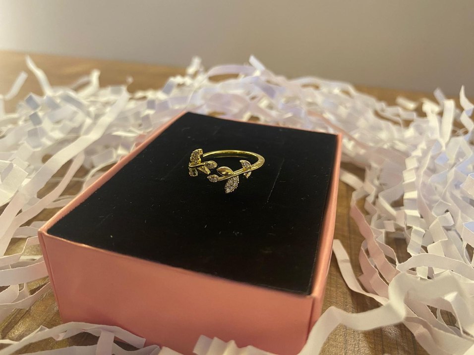 Altın renginde, yaprak desenli ve payet detaylı kadın yüzük. Minimalist ve bohem tarzları birleştirir, klasik şıklık sunar. Romantik akşamlar için ideal.