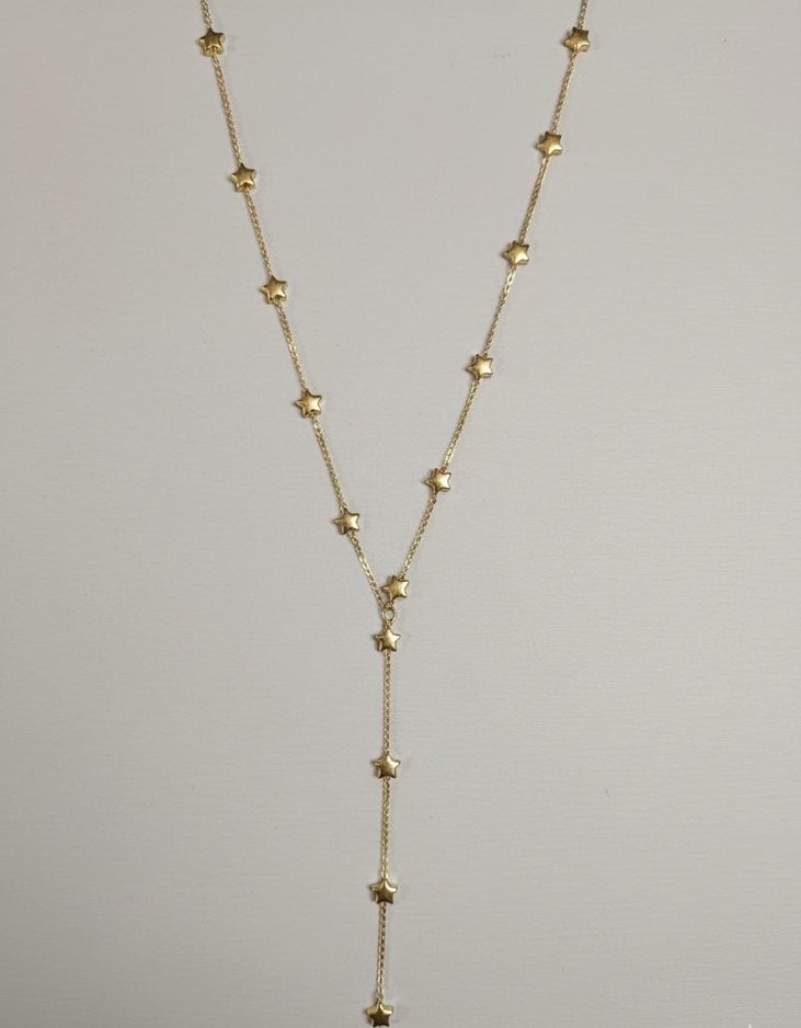 Uzun zincir detaylı, küçük yıldız işlemeli parlak altın renkli kolye. Minimalist, bohem tarzıyla günlük kullanıma uygundur. ✨ Ürün materyali pirinc kaplamadır.