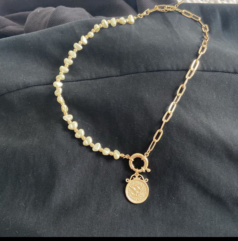 Gold zincir detaylı, inci aksanlı madalyon uzun kolye. Madalyon para kolye ucu ile trend, günlük kullanıma uygun. ✨