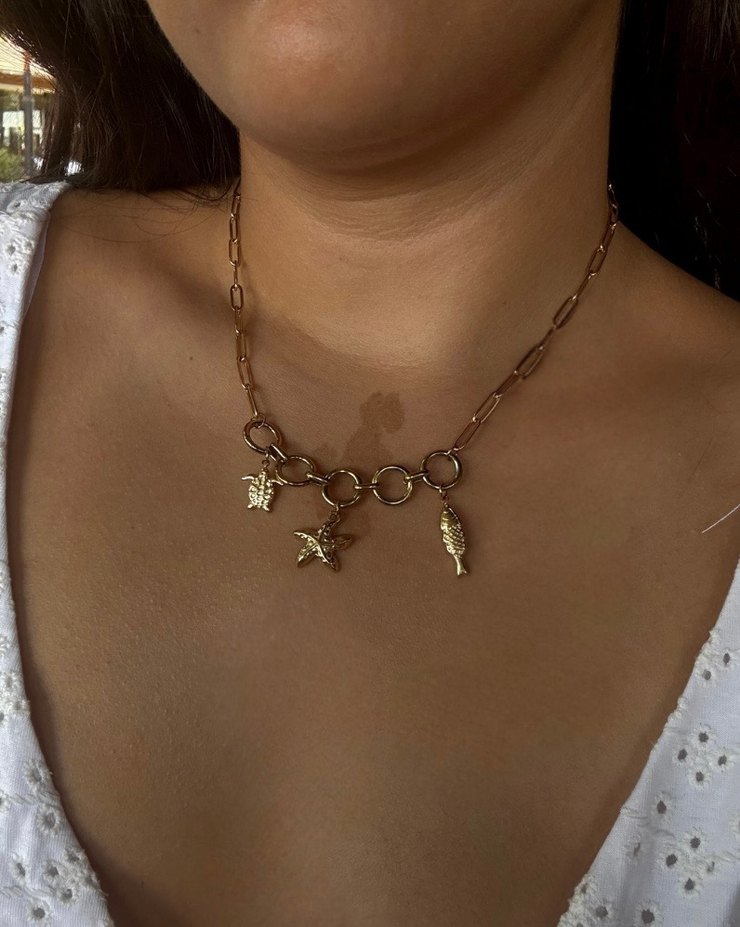 Parlak altın renkli bu çelik kolye, yıldız, balık ve kaplumbağa figürlü bohem tarz zincir detaylarına sahiptir. Midi uzunluktadır, günlük kullanıma uygundur. ✨ Denizde havuzda kararma solma yapmaz. #takı #çeliktakı #goldtakı #paslanmazçeliktakı #yazlıktakılar #günlüktakılar #kolye #küpe