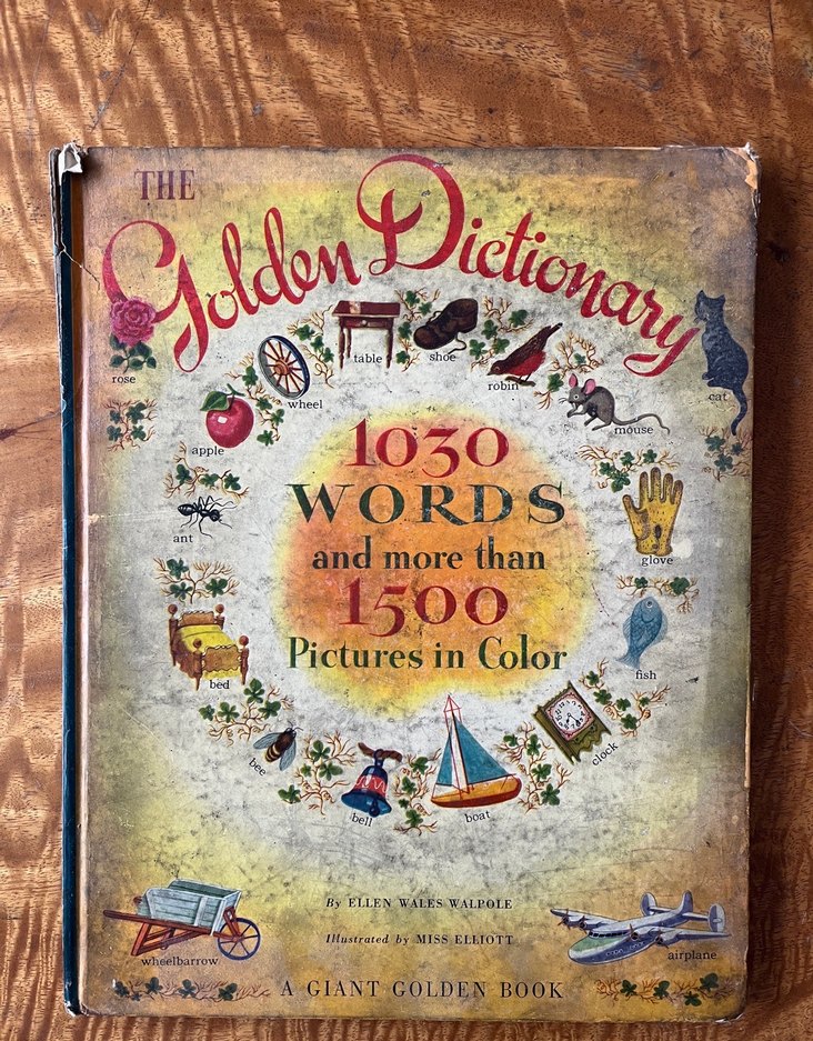 Golden Dictionary, 1030 kelime ve 1500'den fazla renkli resim içerir, kapsamlı bir görsel sözlüktür.