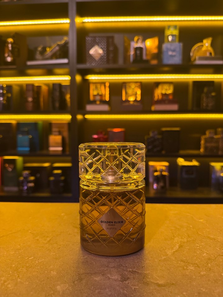 Golden Elixir parfümü, şık dokulu cam şişesi ve altın rengiyle zarif bir koku deneyimi sunar.