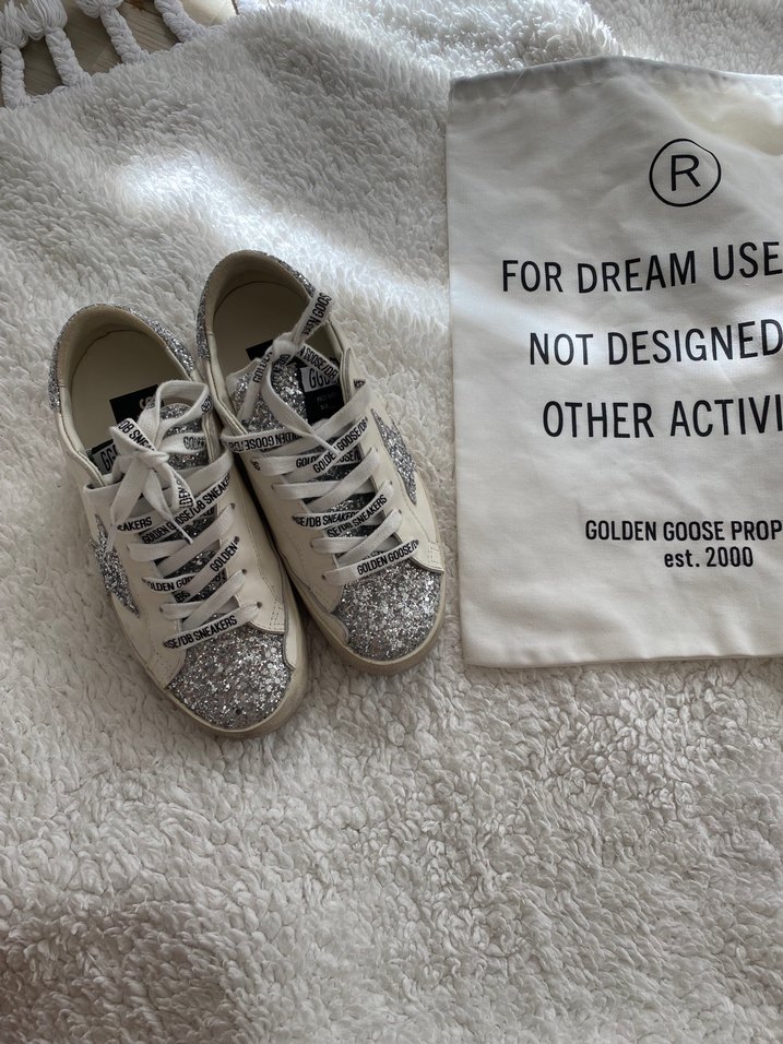 Golden Goose Deluxe kadın beyaz ve gri renkli, parlak sim detaylı ve baskılı desenli sneakers. Kauçuk tabanlı, hakiki deri marka logolu toz torbası ile birlikte. ✨