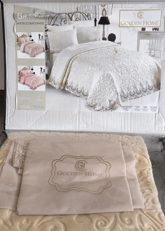Golden Home markasının Bang model dantelli battaniye takımıdır. Çeyizlik olarak alındı, hiç kullanılmadı, sıfır ve orijinal kutusundadır. Setin içinde battaniye ve uyumlu parçalar yer alıyor. Yumuşak dokulu, kaliteli ve gösterişli bir üründür.