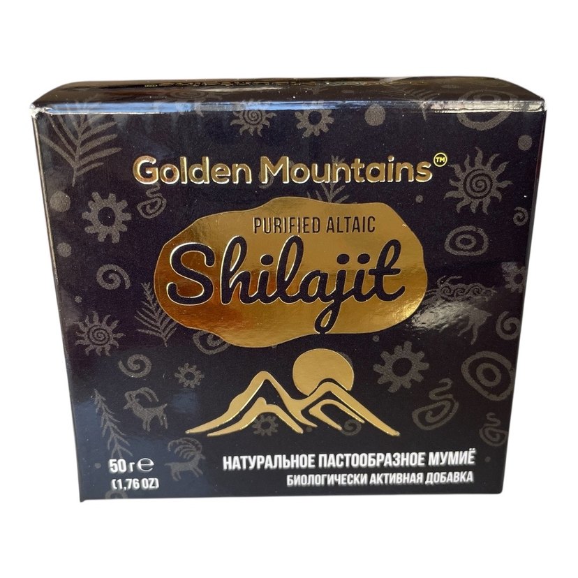 Golden Mountains Saf Altay Shilajit mumiyo, doğal pasta kıvamında bir takviyedir. Parlak altın renkli ambalajda, 50 gram ağırlığındadır. ✨
