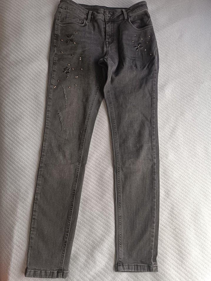 GOLDEN POINT marka, füme renkte pamuklu kadın jean pantolon. Eskitme görünüm ve şık boncuk detaylarıyla modern bir tarz sunar. 36/Small bedendir. Dar paça kesimi ve regular/standart bel formuyla hem şık hem rahat bir kullanım sağlar. Günlük ve özel gün kombinleri için oldukça idealdir. İçerik bilgisi etiketi görsellerde yer almaktadır.