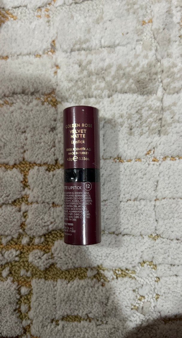 Golden Rose Velvet Matte Ruj, koyu bordo renginde, zengin renk ve mat dokusu sunar. Türkiye'de üretilmiştir.