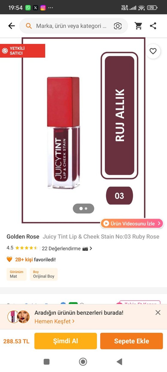 Golden Rose Juicy Tint Dudak ve Allık No:03 Ruby Rose, parlak bordo renginde mat görünüme sahiptir. Orijinal boyda olup dudak ve yanaklarda kullanılabilir.