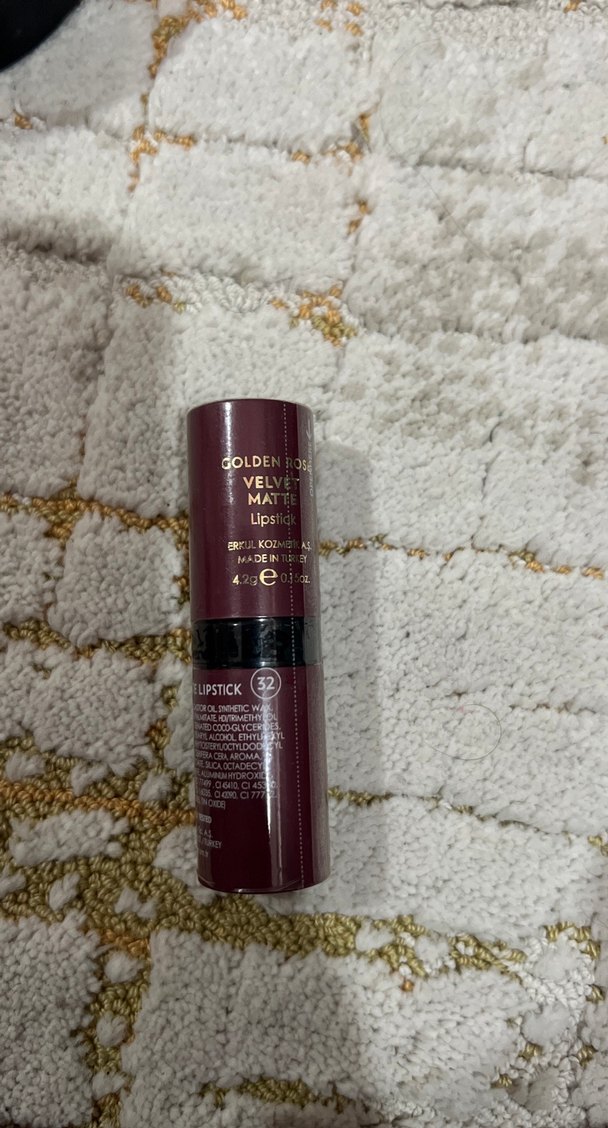 Golden Rose kadife mat ruj, koyu bordo tonunda, zengin renk ve pürüzsüz bitiş sağlar.