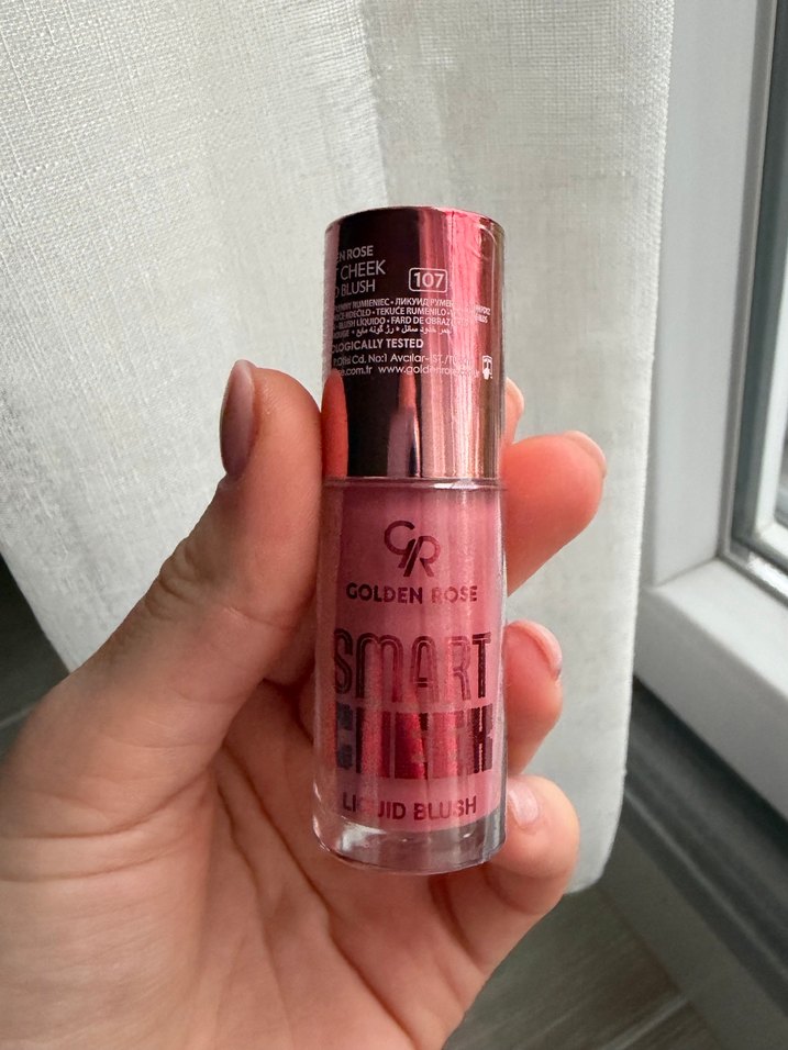 Golden Rose markalı parlak pembe sıvı allık, yanaklara doğal bir ışıltı verir ve kolay uygulanır. Üzerinde JIDBLUSH 107 etiketi bulunur.