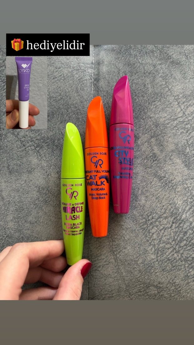 Golden Rose'un canlı yeşil, turuncu ve pembe tüplerde renkli maskara seti. Kirpikleri dolgun ve belirgin yapar. 3’lü fiyattır Sadece denendi kirpiklerimde beğenemedim lykd kaş jeli hediyedir(sadece 1 kere denendi) maybelline muadili çok sabit tutuyor