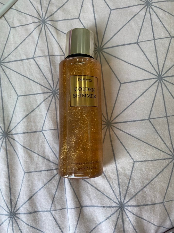 Golden Shimmer kadın parfümü, içinde ışıltılı altın parçacıklar bulunan sıvı içerir ve metalik gümüş kapaklıdır. ✨