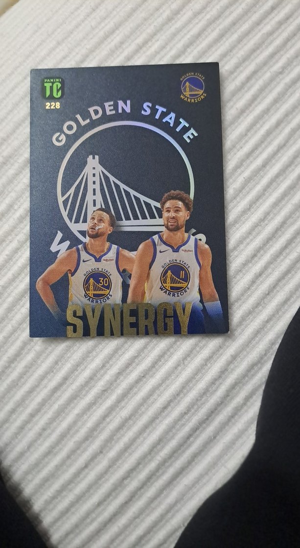 Golden State Warriors oyuncularını içeren parlak altın rozet, "SYNERGY" yazılı, Panini TC tarafından 228 numaralı. Cesur pop kültür stiliyle athleisure için.