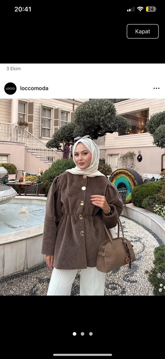 Kahverengi yün kaban, yüksek yakalı, uzun kollu, etnik desenli ve bol, kabarık kesimlidir. Midi boyda, günlük kullanıma uygun. 1 kez kullandım isde yok son fiyat