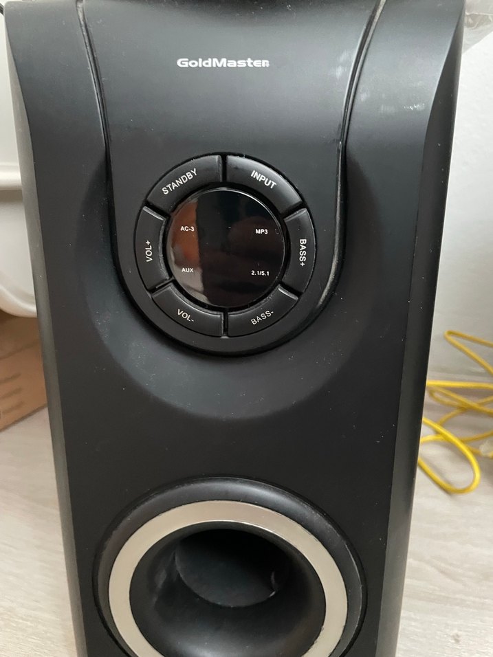 GoldMasten marka siyah müzik sistemi, ses, giriş, bas ve bekleme düğmeleriyle donatılmıştır. Yuvarlak tasarımlı ve hoparlör çıkışı bulunur. 5+1 sinema sistemi hoparlorü ve ses kolonlarıyla verılecektir