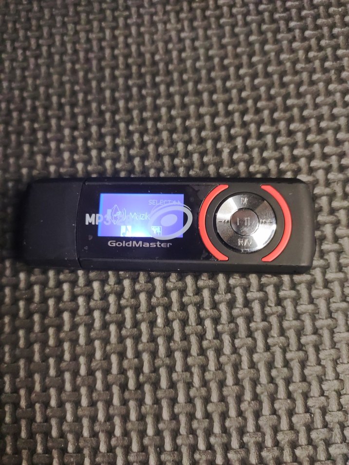Küçük ekranlı ve kontrol düğmeli siyah GoldMaster MP3 müzik çalar. Kompakt ve taşınabilir tasarım.