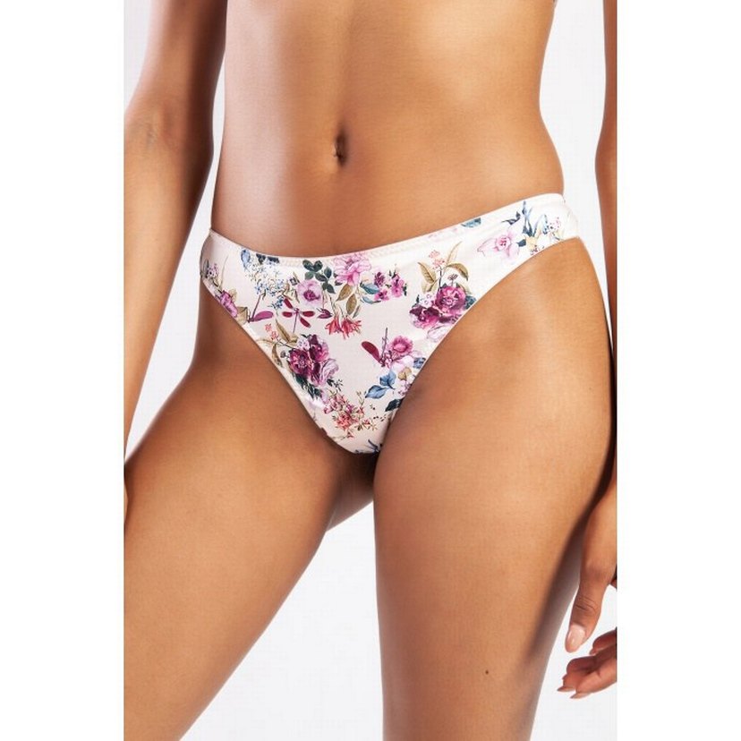 Çiçek desenli, dantelli beyaz bikini altı. İnce askılı ve vücuda oturan, bohem tarzda rahat bir model.