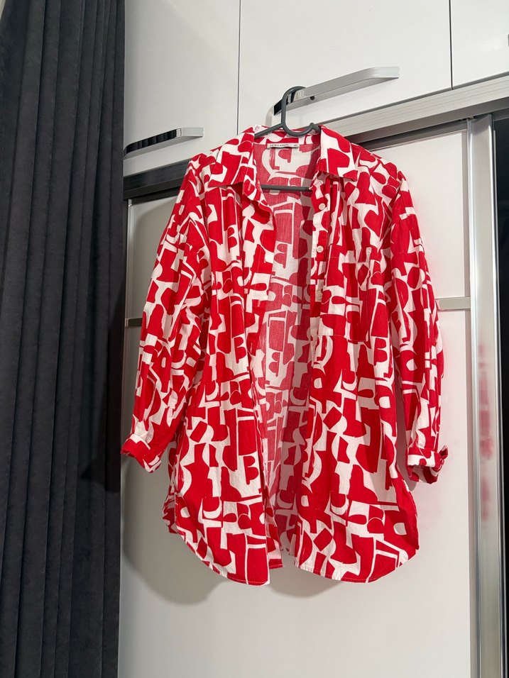 Renkli baskılı, uzun kollu, yakalı ve düğmeli kısa boy kadın gömleği. Rahat ve salaş kesim, sokak stiline uygun.