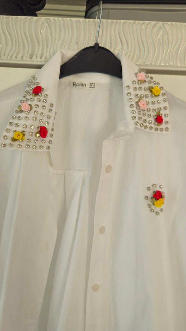 Pamuklu beyaz kısa mini gömlek, yakasında düğmeli ve kısa kollu. Nakışlı çiçek detayları ve küçük taşlarla süslenmiş, bol kesim ve bohem tarzda günlük kullanıma uygun.