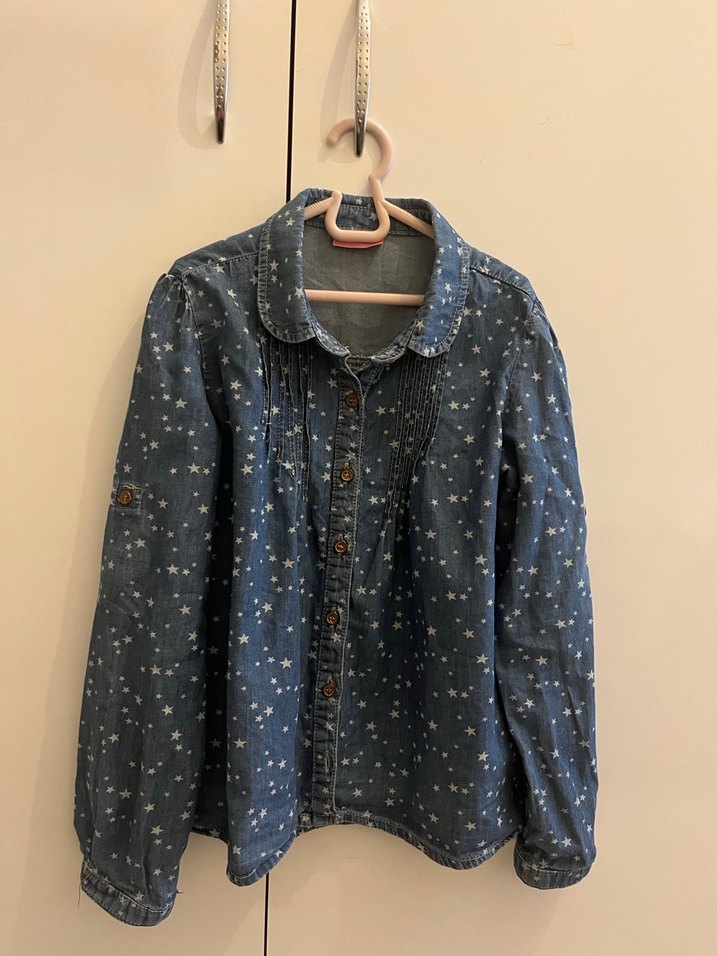Düğmeli önü ve yakalı kesimi olan bol kesim cocuk denim gömlek. Uzun kollu, normal boyda, hafif yıldız desenli, günlük rahat kullanım için uygundur.