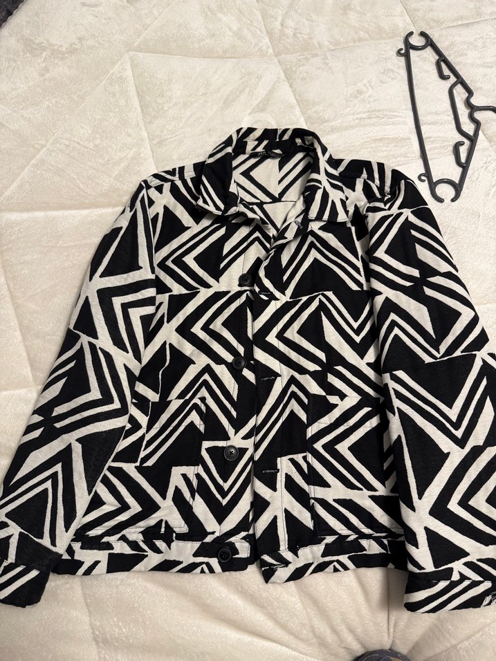 Siyah beyaz baskılı, düğmeli, uzun kollu, notlu yaka ve bol kesim midi uzunluğunda kadın gömleği. Günlük sokak stili için uygundur. Erkek zara marka çok iyi durumda