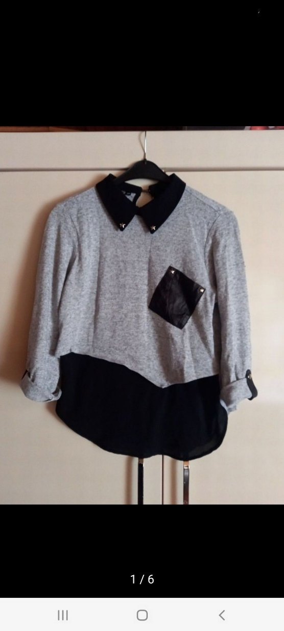 Gri uzun kollu, düğmeli ve yakalı gömlek, rahat kesimi ve siyah detaylarıyla. Herhangi bir sorunu yoktur. %50 polyester %50 viscon kumaştır. Yaka ve kol kısmında deri detayı vardır.