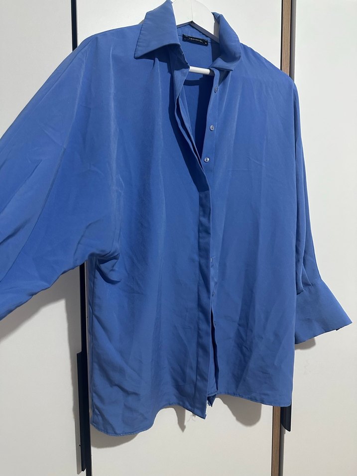 Gömlek yarasa kolludur ürün hasarsızdır yalnızca kolunun birinde ufak bir yırtılma vardır kolları düğme detaylı uzun mavi gömlek