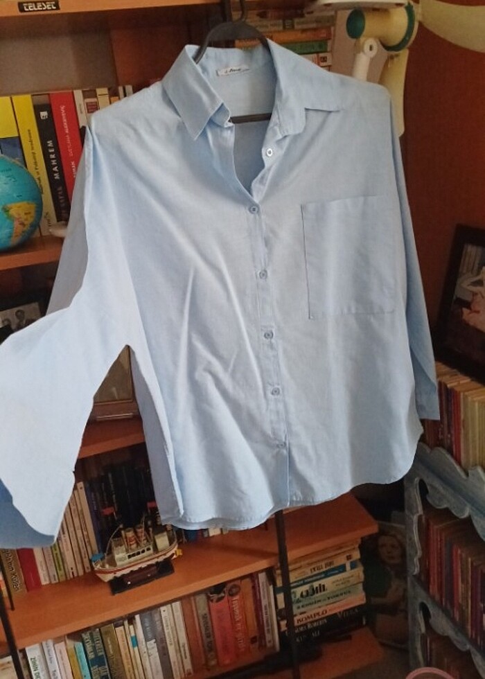 Mavi renk gömlek Çok istemiştim, Çok aradım ve aslında acele ile aldım ve toplantıya giderken bir kez giydim. Daha sonra giyemedim ceket içinde kullanamadim. Kolları biraz bol degaje gibi. Ama temiz ve bir kere giyildi,temizlendi dolap bekliyordu ,şimdi isteyen bir hanımefendinin dolabına gitmek üzere satışta.