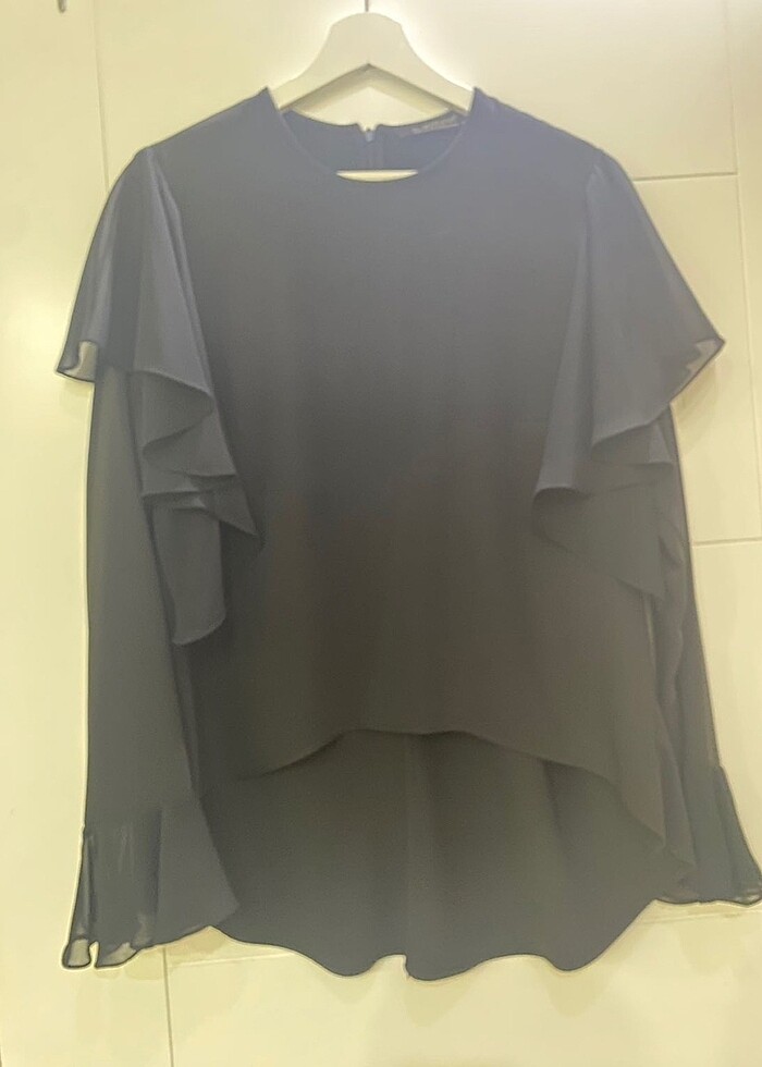 Bikaç kez giydim. Bir sıkıntısı yoktur. Arkadan gizli fermuarlıdır. Önü kısa arkası uzun gömlek tişört tarzındadır. Omuzlarda ve kol ağzında şifon fırfır detayları bulunmaktadır