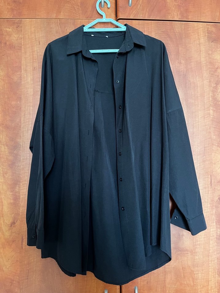 Siyah renkli, uzun kollu ve salaş kesim kadın gömlek. İpeksi dokuda, düğmeli ve notalı yaka detaylı, minimalist tarzda günlük kullanıma uygun. Etiketini kestim
