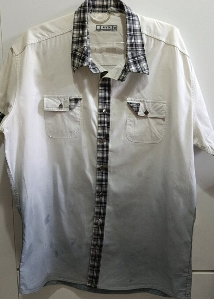 Beyaz kısa kollu gömlek üzerinde çizgili şeritleri var düğmeleri metal iyi durumda temiz resimlerde görüldüğü gibidir temiz ütülü olarak teslim edilecek