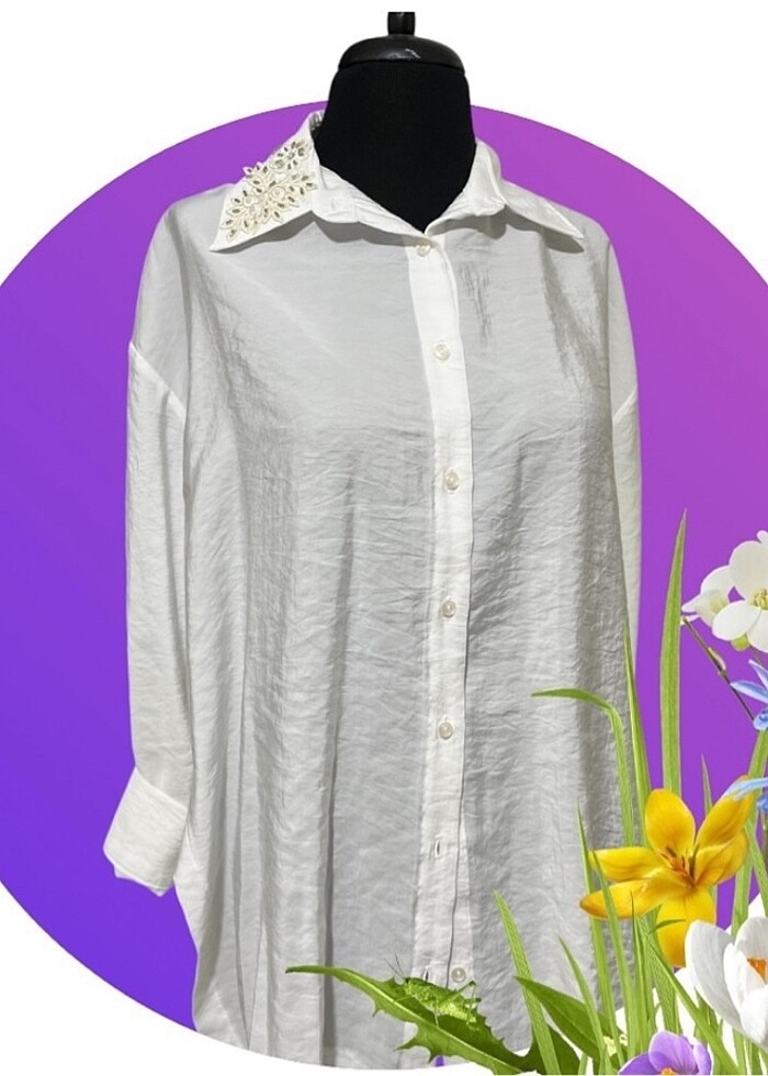 Kumaşı kaliteli yakası işlemeli fransız güpürü yırtmaçlı tayt üzerine önden bağlanabilen salaş gömlek