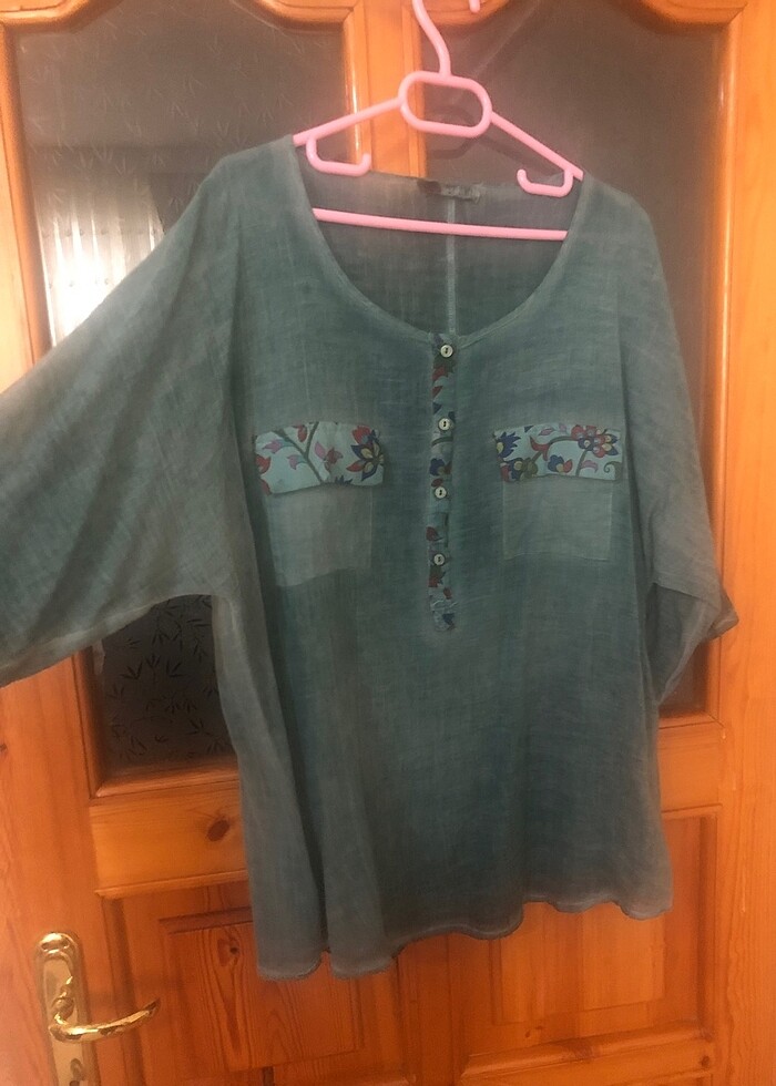 Yarasa kol büyük beden gömlek. Kumaşı ince olduğu için iç gösterebilir. 50-52 bedene denk gelir