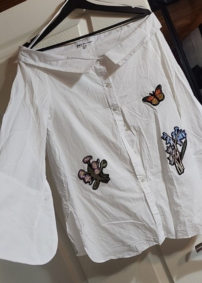 Kayık yaka omuzları acik gomlek. S BEDEN . 36 38 uyumludur sıfırdır.