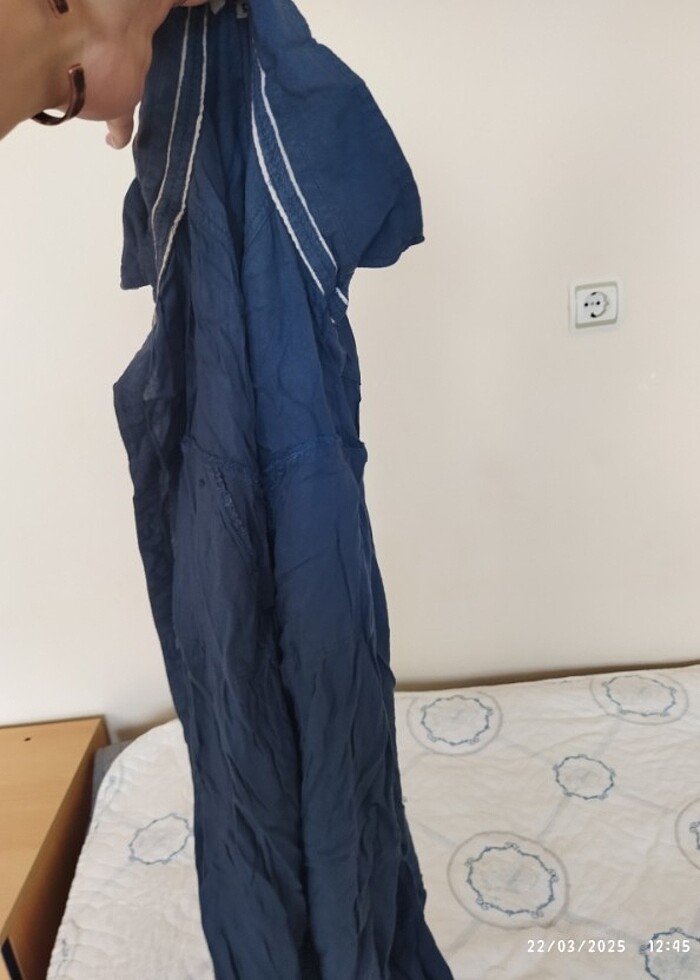 Çok severek almıştım ama artık olmuyor ayrıca gördüğünüz üzere kırışmaya çok çok müsait bir gömlek. Mavi lacivert arası bir renkte.