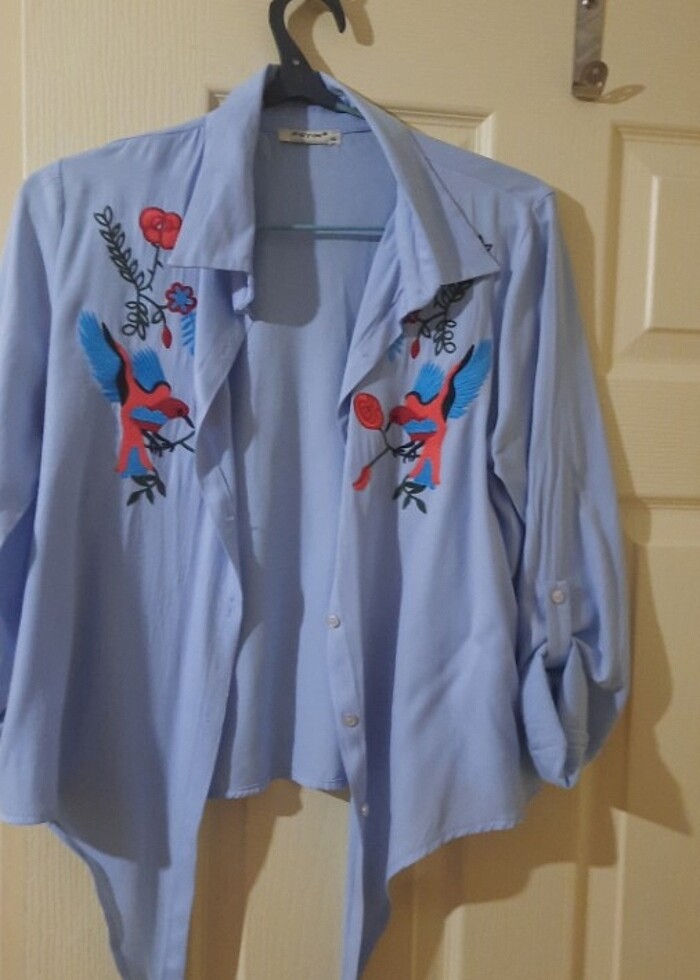 Önden bağlamali iki tarafında kuş ve çicek nakışı olan gömlek. Etiket 42 ama 38-40 beden için daha uygun.