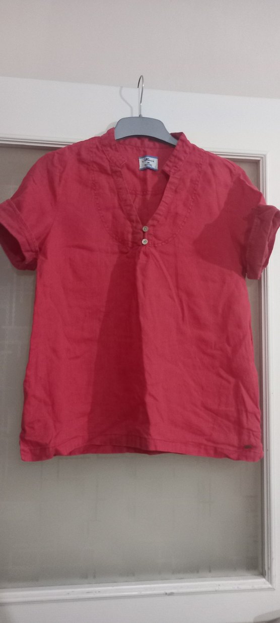 Kırmızı keten kumaştan, V yaka ve düğmeli kısa kollu gömlek. Rahat kesimi ve normal boyu ile günlük kullanıma uygun. ✨