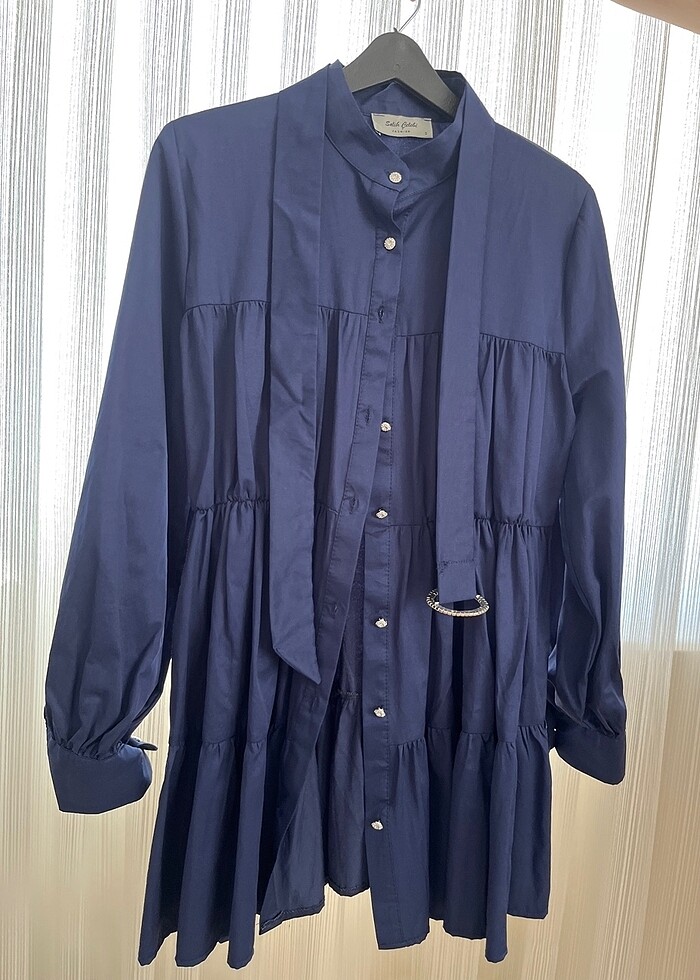Ürün çok şık olmasından ve bu tarzda giyinmediğim için hiç kullanılmamıştır . Işıktan dolayı rengi farklı görünmüş olup lacivert renktedir. Kemer detayı mevcuttur.