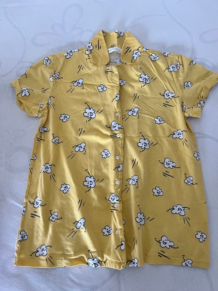 Sarı renkli, kısa kollu, düğmeli, çiçek desenli pamuklu, bol kesim kadın gömlek.