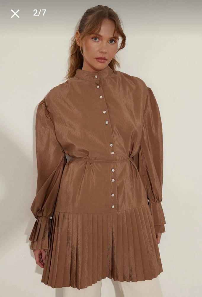 Hoops marka Kahverengi piliseli gömlek, uzun kollu ve bol kesim midi tunik. Parlak sentetik kumaştan, ofis ve sokak modası için uygun, alırken kemeri yoktu ve aldıgımda bir taşı düşmüstü fiyatı o yüzden uygun tuttum trendyolda şuan 700 tl sadece 1 kere giyildi L-Xl ben S-M giymeme rağmen çok güzel oldu.