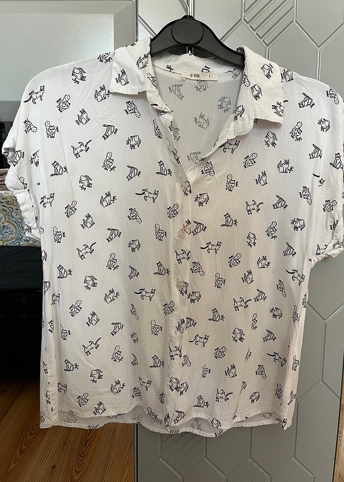 Kedi desenli beyaz gömlek
