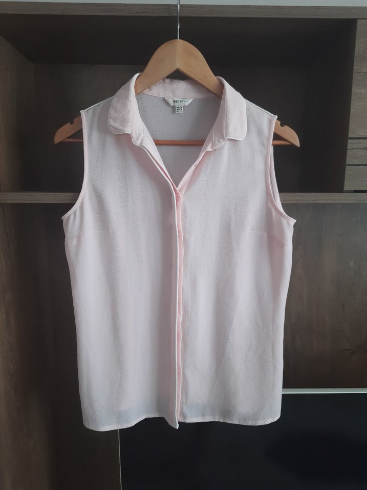 Kolsuz,düğmeli ve yakalı gömlek. Sentetik kumaştan, regular fit ve midi boyda, rahat sokak stili için uygundur. Beyaz biye detayları var. Göğüs ve bel arka tarafta pens detayı mevcut.