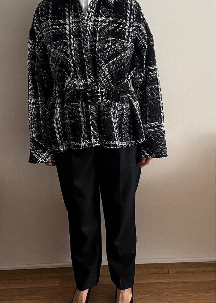Tüvit gömlek ceket Oversize modeli çok az kullanıldım herhangi bi defosu belinde kemeri var temiz yeni gibidir rengi siyah beyaz içinde küçük ışıltı var