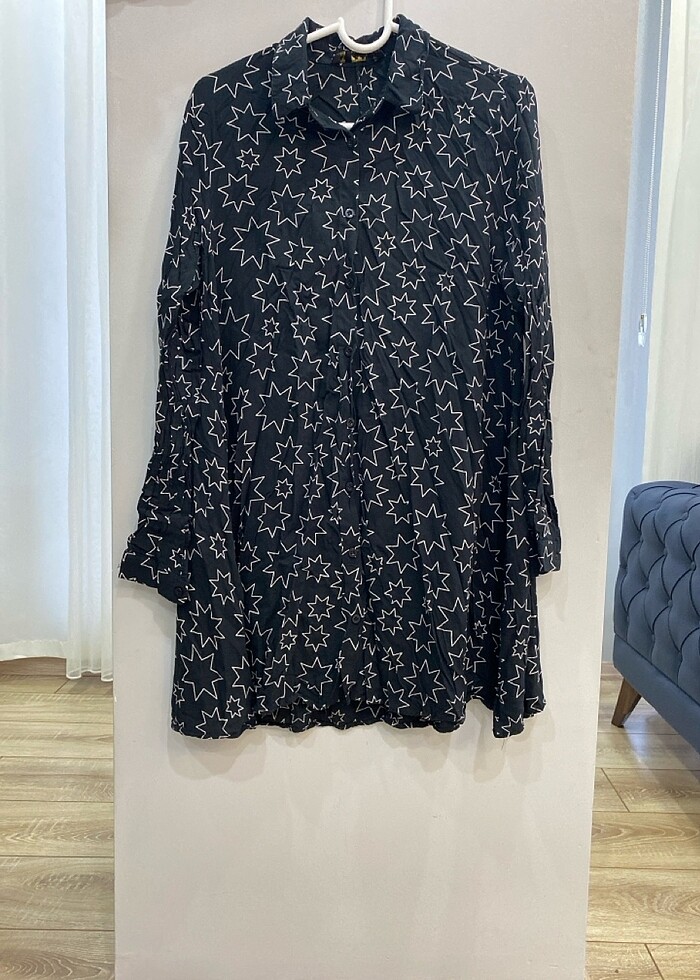 Önü komple düğmeli çok şık yıldız desenli kumaş gömlek elbise