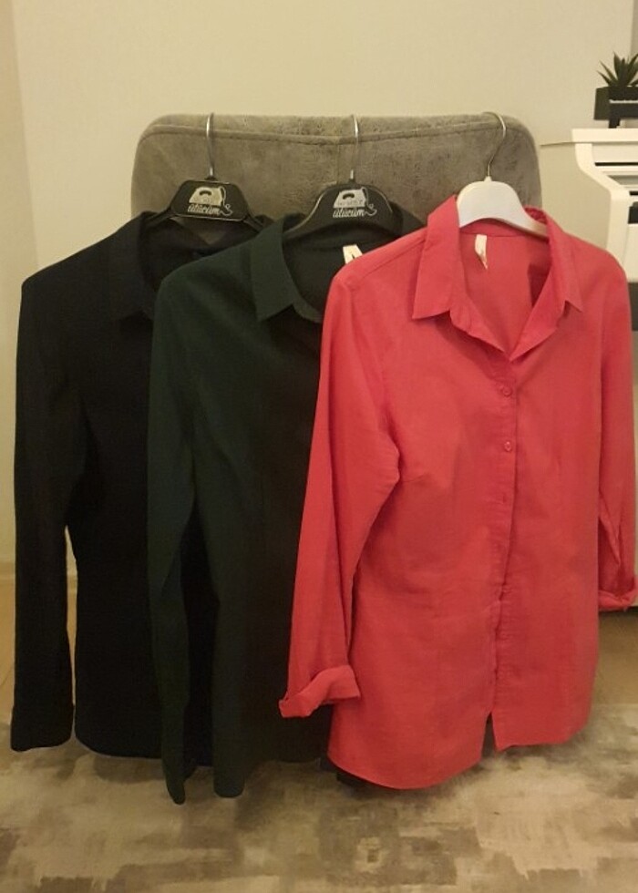 Defacto 3 renk gomlek 38 M beden.Iyi durumda 55 kg a kadar olur maalesef kilo aldığım için satıyorum, çok kullanışlı ve şık. Gri püsküllü gomlek S beden .Spor ceket Olgun Orkun M bedendir.Her birini 90 TL den satışa sunuyorum.Defo yoktur. Defacto gömlekler pembe , koyu yeşil ve laciverttir. Hepsi canlıdır soluk değildir.