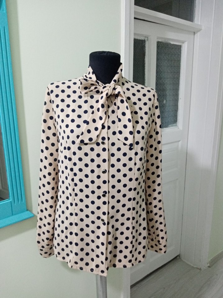 Bej, uzun kollu, yakalı ve düğmeli kadın gömlek. Trendy puantiye desenli, regular fit, sentetik kumaştan günlük rahat sokak stili için uygun.
