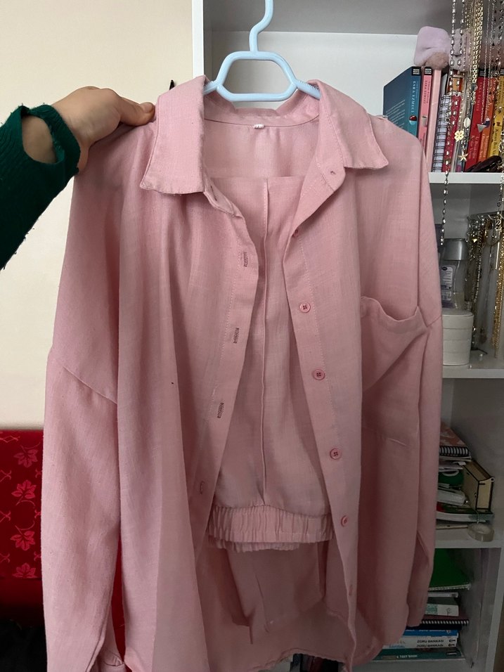 Rahat kesim, pastel pembe keten kumaştan kadın gömlek. Yakalı, düğmeli, uzun kollu ve ön cep detaylı, günlük rahat kullanım için uygundur. Pantolon hiç giyilmedi gömlek iyi durumda