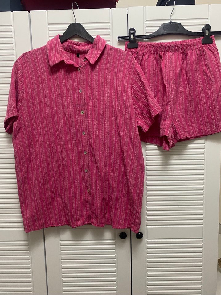 Pembe, düğmeli, kısa kollu, pamuklu ve bol kesim gömlek. Boğaz kesimi ve pastel tonuyla günlük rahat sokak stili için uygun.