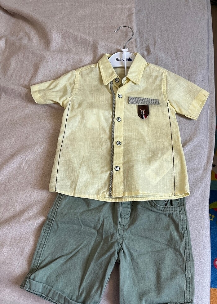 Erkek bebek gömlek şort takım hediye geldi hiç giyilmedi. 1 Yaş için uygundur. #gömlek #şort #sarı #haki #takım #bebek #çocuk #takım